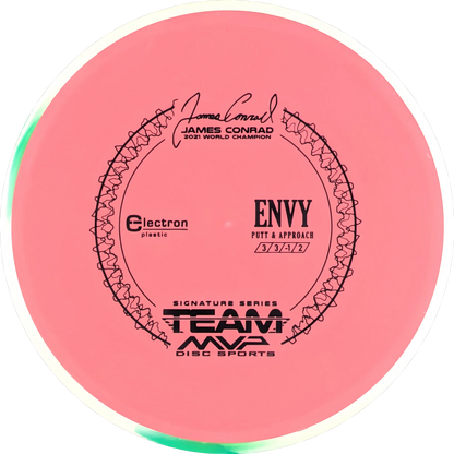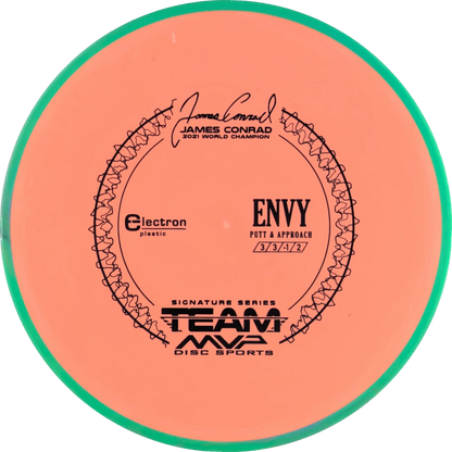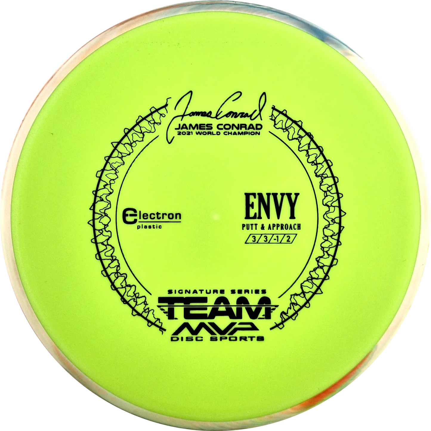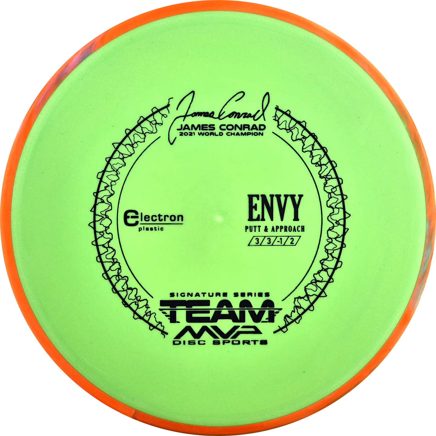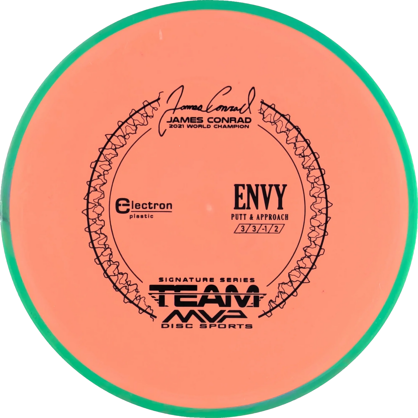 Axioms Envy is a stable putter that many also use to throw on the shorter holes. The disc is particularly known for being the disc that James Conrad threw into the chains from 80 meters away at the 2021 World Championships, which he ended up winning because of that very throw.