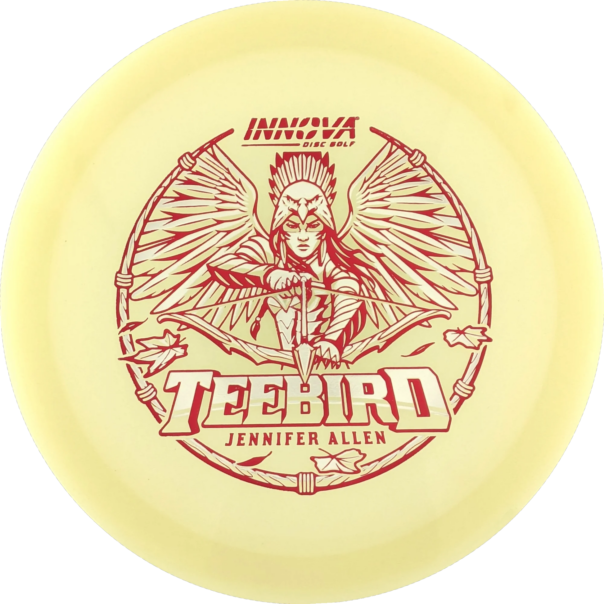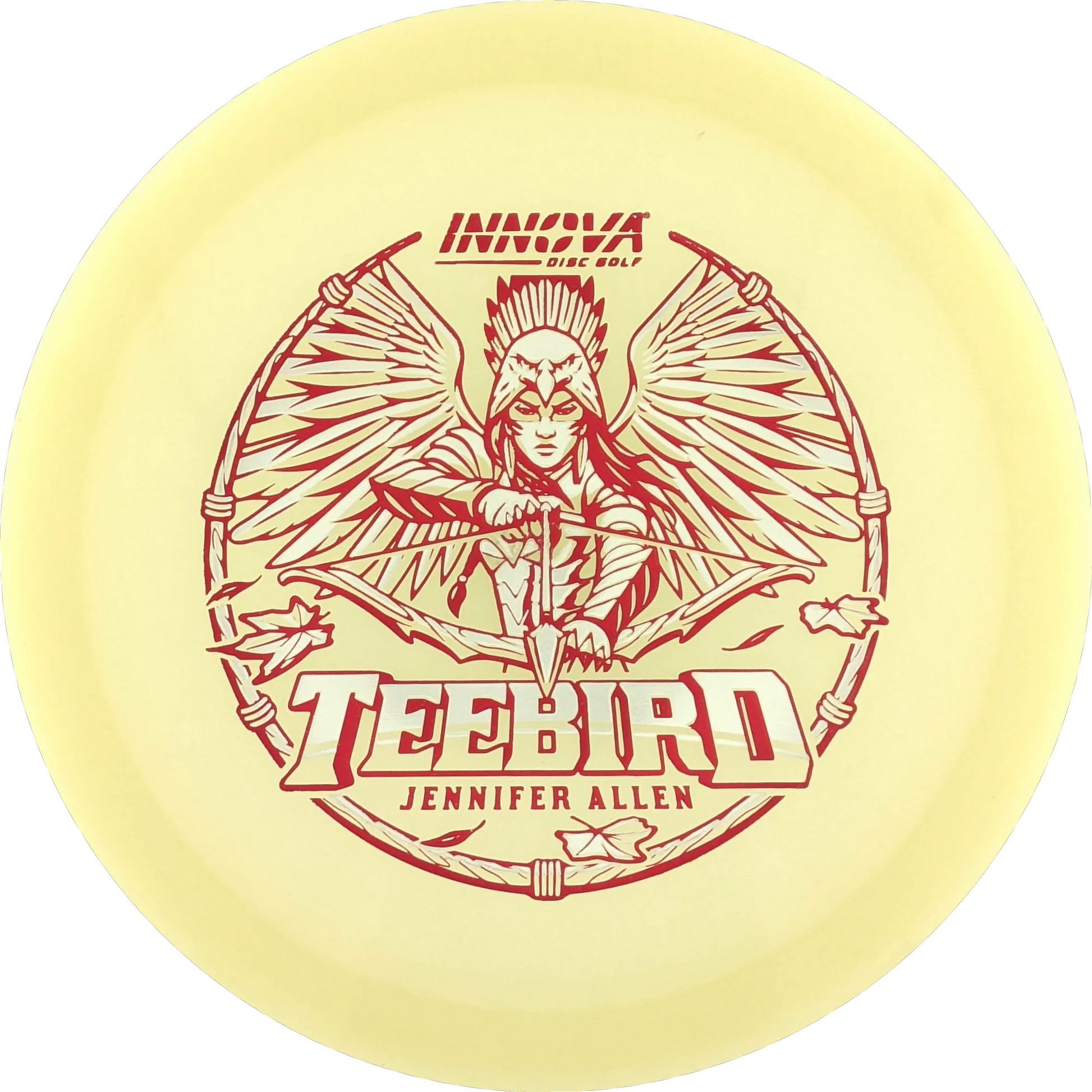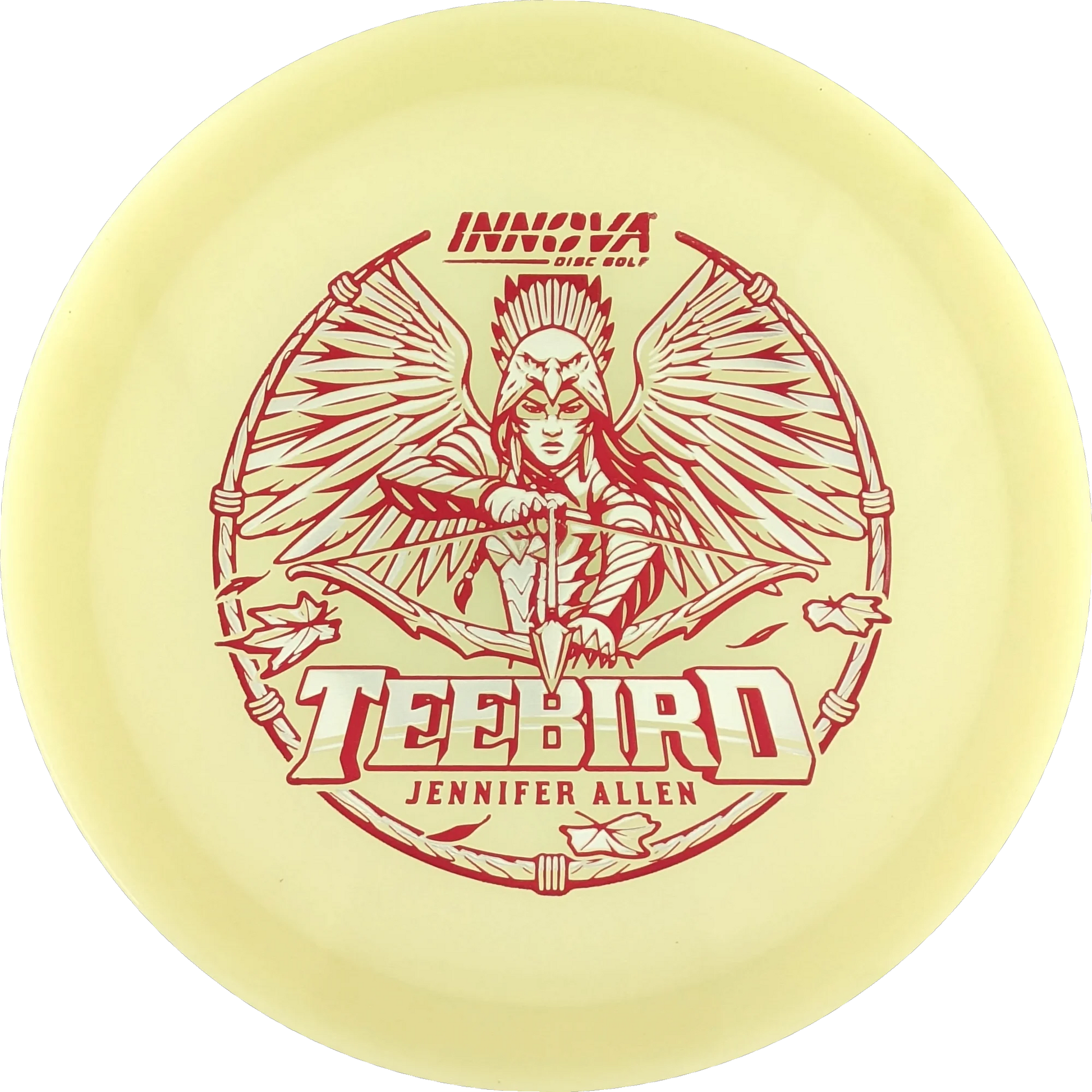 The Innova Teebird is one of the most iconic fairway drivers in the world, and the Jennifer Allen edition has long been a favorite due to its added stability. This 2026 model in Proto Glow Champion plastic takes that performance to a new level. The Proto Glow material not only provides the disc with a powerful glow-in-the-dark effect for night play but also adds a unique texture and durability to the Champion plastic. Jennifer Allen's Teebird is known for handling plenty of power and delivering precise shots with a reliable fade, making it an essential part of the bag for players seeking maximum control on the fairway.