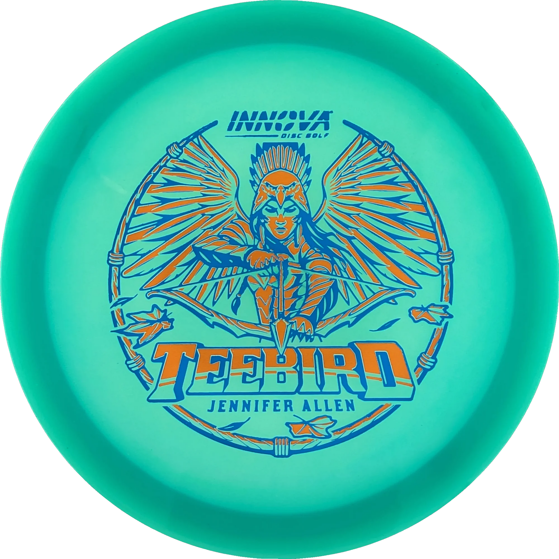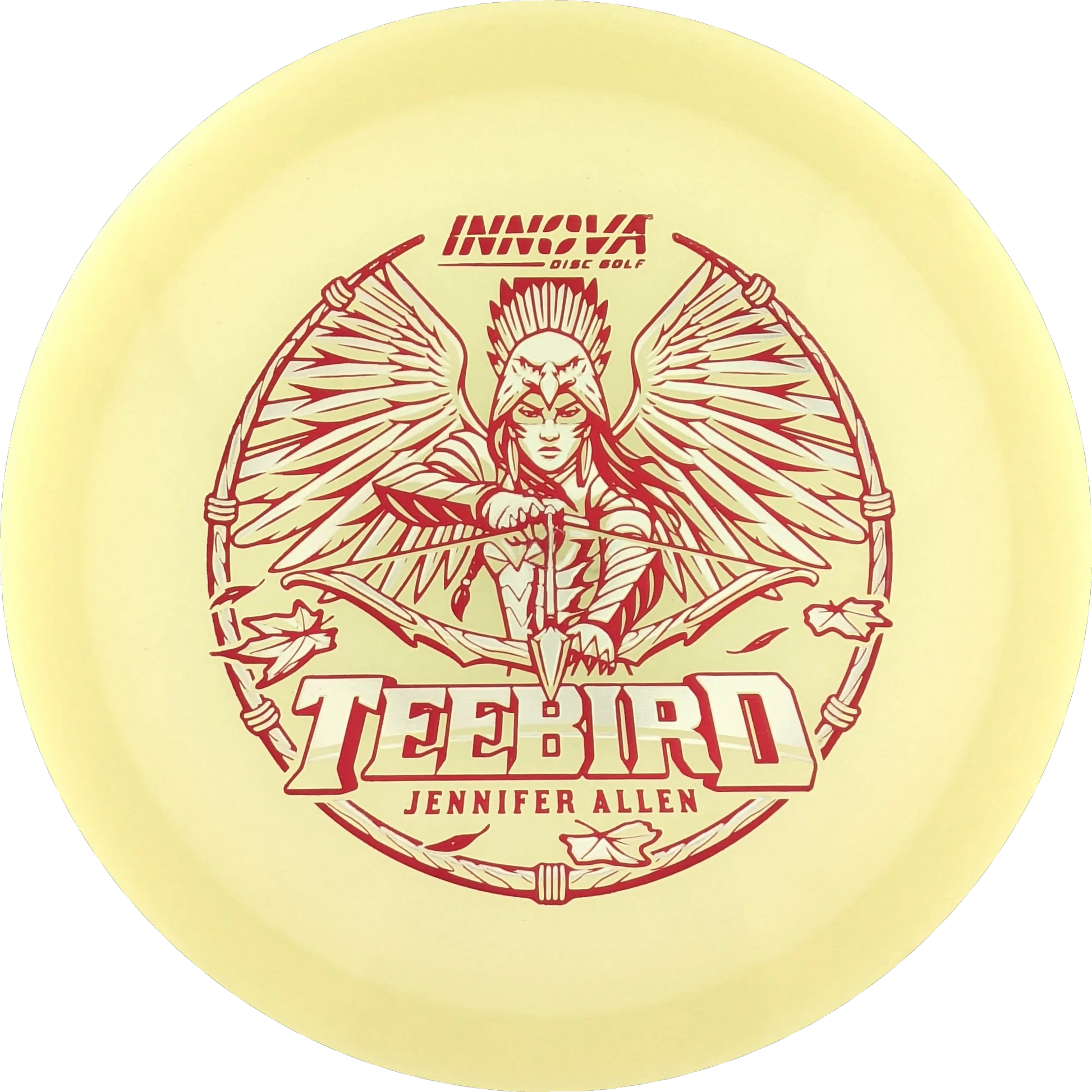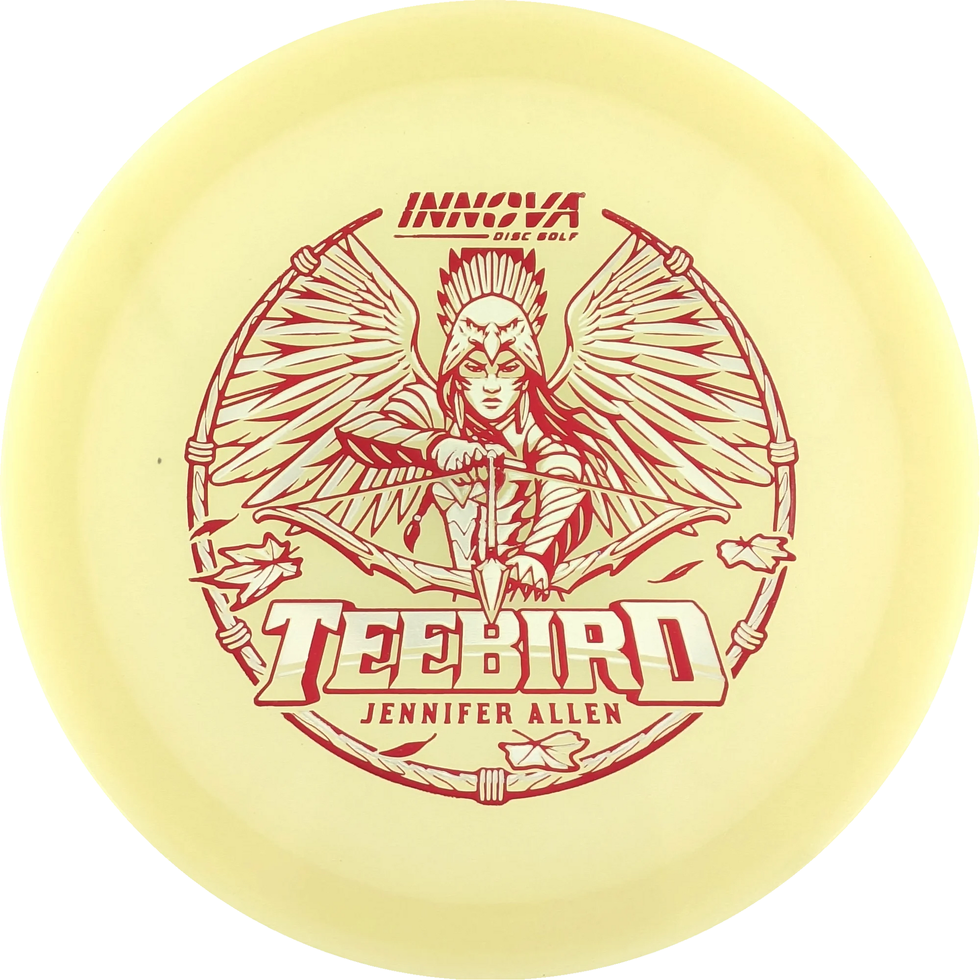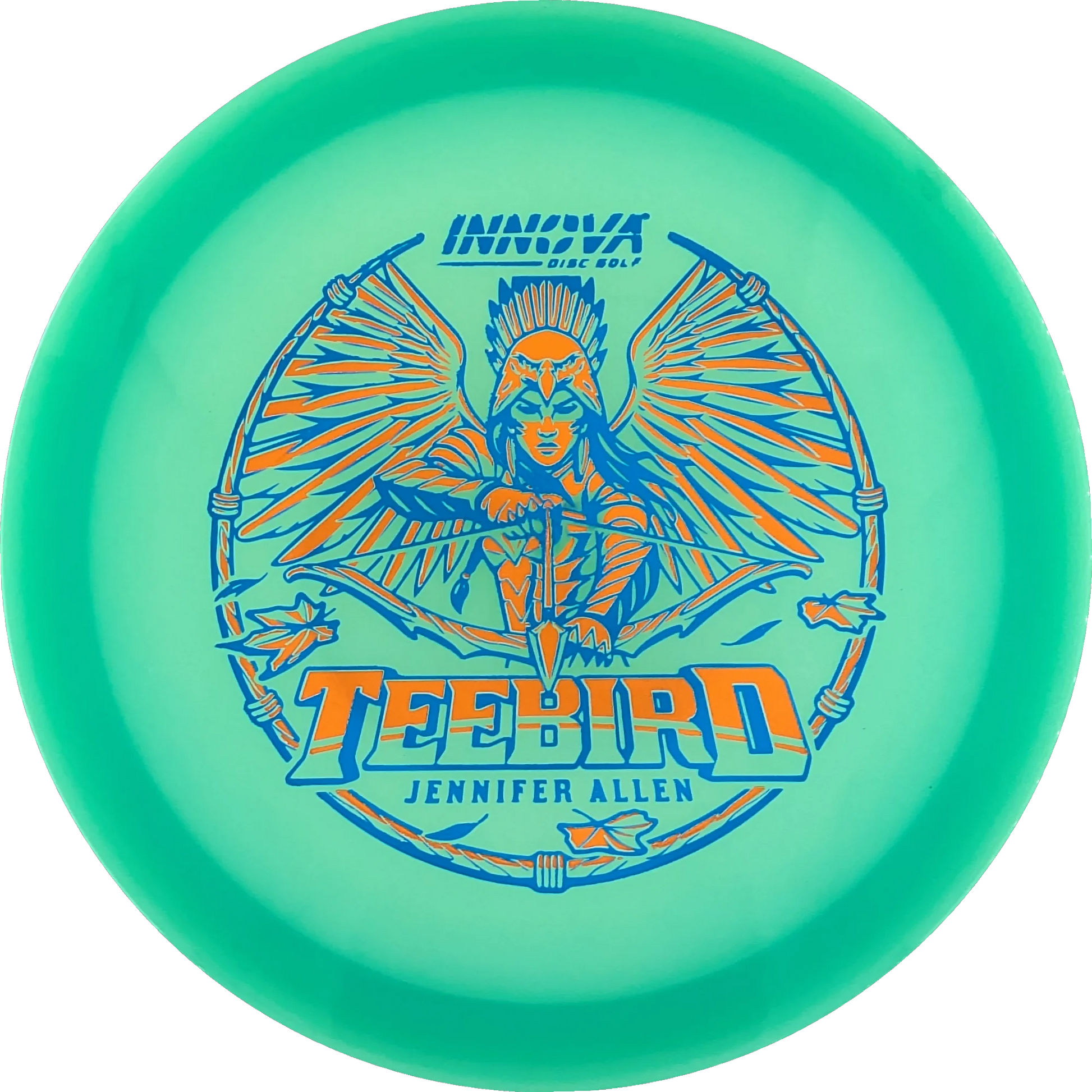 The Innova Teebird is one of the most iconic fairway drivers in the world, and the Jennifer Allen edition has long been a favorite due to its added stability. This 2026 model in Proto Glow Champion plastic takes that performance to a new level. The Proto Glow material not only provides the disc with a powerful glow-in-the-dark effect for night play but also adds a unique texture and durability to the Champion plastic. Jennifer Allen's Teebird is known for handling plenty of power and delivering precise shots with a reliable fade, making it an essential part of the bag for players seeking maximum control on the fairway.